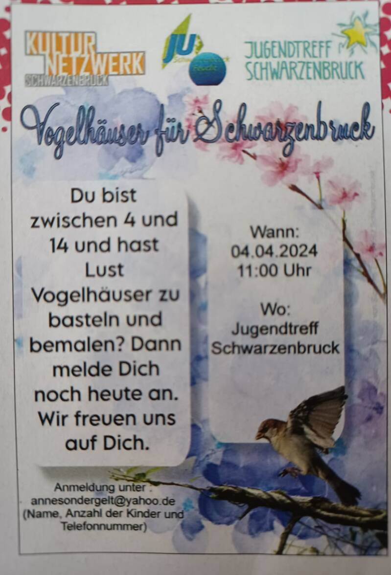 Vogelhäußer für unsere Gemeinde SchwarzenbruckWir möchten mit euch gemeinsam für unsere Gemeinde Vogelhäußer bauen und bemalen.Am 04.04.2024 treffen wir sich deshalb um 10 Uhr im Jugendtreff Schwarzenbruck. Egal ob Bauen und Bemalen oder nur Bemalen, sind alle Kinder - und Jugendliche dazu recht herzlich eingeladen.Ihr könnt selbst entscheiden wieviel ihr macht, ob Ihr die mit nachhause nehmen wollt oder an die Gemeinde spenden wollt. Die gespendeten Vogelhäußer werden dann dem Bauhof übergeben und an den öffentlichen Flächen der Gemeinde angebracht. Lasst uns gemeinsam die Gemeinde Schwarzenbruck gestalten und verschönern.